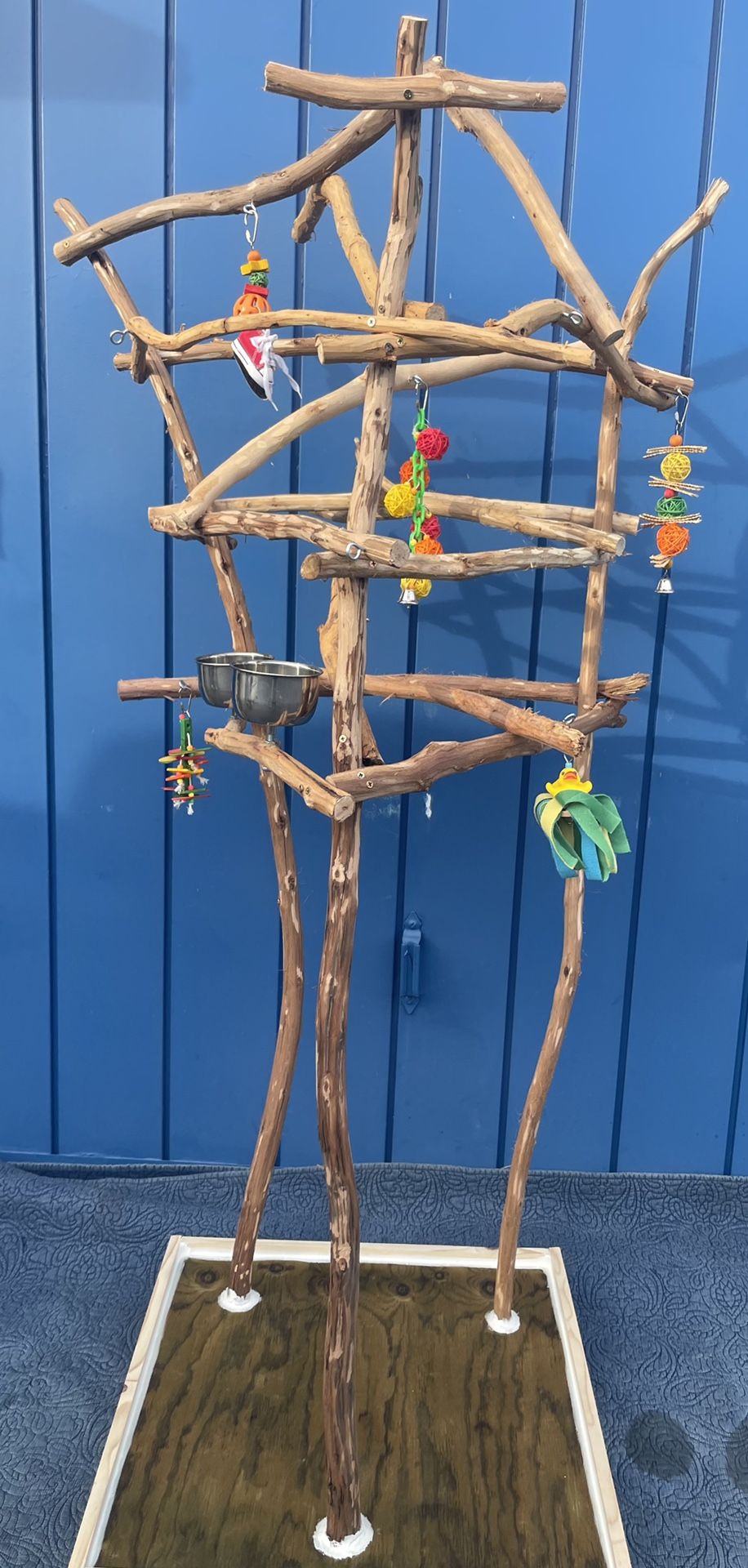 | Product Features | An artsy custom perch tree , approx 5’ tall on a compact 26” x 26” base ( on casters)… perfect for those with cats or dogs and / lil kiddos… keeps them up and away … bowls included … a great Socializer or open perch for wing Flappin and fun … Can and will deliver ( their big n bulky )… other models avail … 😁👍🏼 pricing is same as to the stores ( wholesale)…. | ||